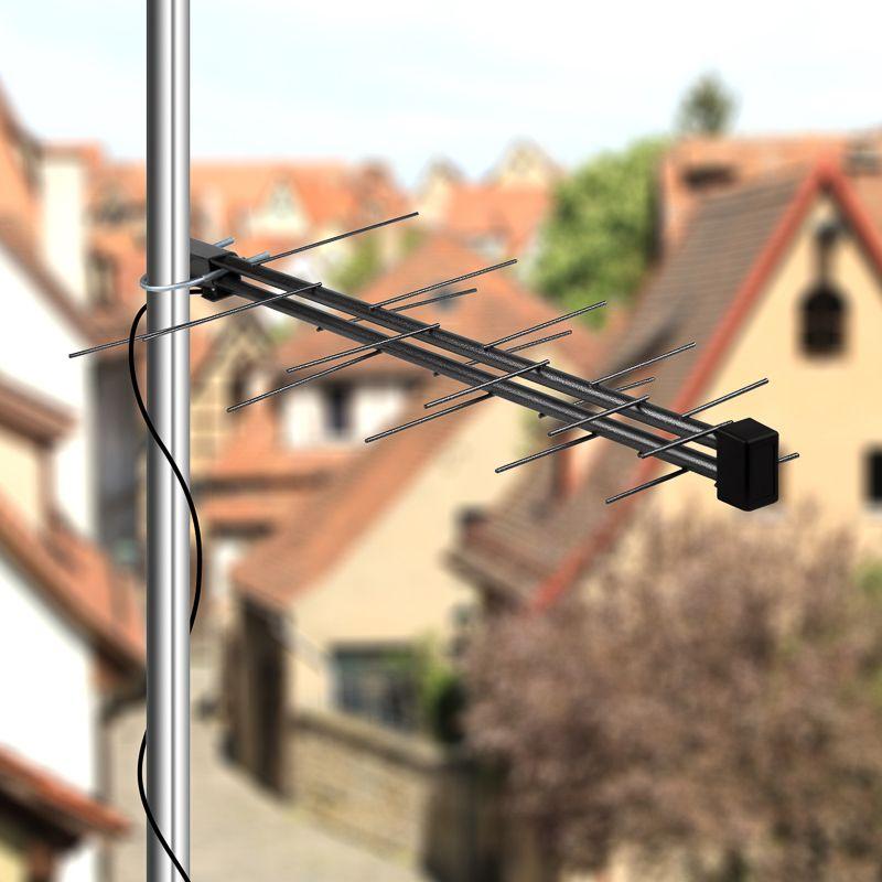 Антенна оснащена встроенным усилителем, предотвращающим помехи от базовых станций сотовой связи и значительно улучшающим прием вещания.
