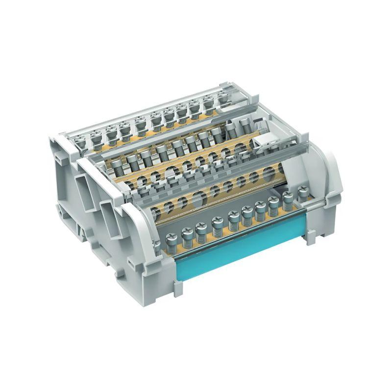 Предназначен для структурированного подключения отводных линий, разведения входящего проводника на несколько потребителей или участков. Позволяет создать упорядоченные системы распределения в электрощитах. Корпус блока выполнен из не поддерживающего горение полиамида PA6.6 и 5-ти токоведущих шин в блоках 160 А, представляющие собой бруски из латуни с 8-ю отверстиями, в которые вставляются провода и зажимаются винтом. Избежать случайного прикосновения к токоведущим частям позволяет защитный экран на корпусе блока. Наличие задней крышки для предотвращения контакта с DIN-рейкой или металлической поверхностью сзади.