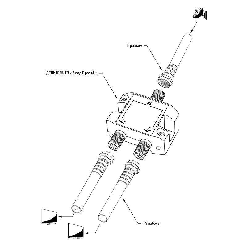 Сигнал, подающийся на вход, делится на две равные части и передается на выходы. Для подключения кабелей используются стандартные F-разъемы.