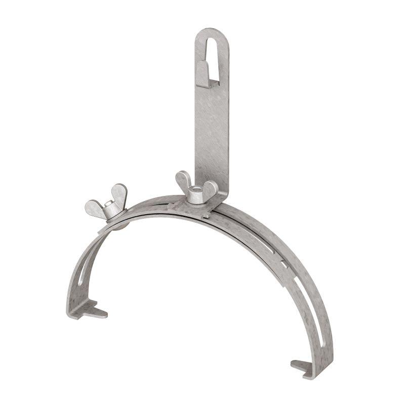 Регулируемый коньковый зажим применяется для фиксации молниеприемной сетки на основе прутка диаметром 8-10 мм на круглом коньке кровли. Проводник крепится безвинтовым зажимом с применением плоскогубцев. Диапазон зажима – 125-205 мм. Материал – горячеоцинкованная сталь.