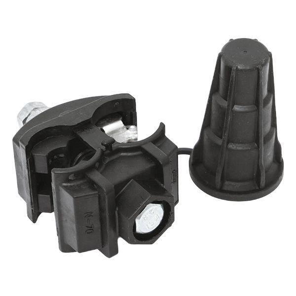 Зажим типа n-70 предназначен для создания герметичного электрического соединения изолированного провода СИП и неизолированного магистрального провода ВЛ. Контакт с изолированным проводом обеспечивается прокалыванием изоляции, с неизолированным проводом – прижимной пластиной. При достижении момента, необходимого для создания надежного электрического контакта проводов, происходит срыв головки болта. Контактные пластины изготовлены из луженного алюминиевого сплава. На прокалывающие и прижимные элементы нанесена контактная смазка. Болт изолирован от контактных деталей зажима. Зажим устойчив к ультрафиолетовому и солнечному излучению, высоким и низким температурам, коррозии и агрессивным атмосферным воздействиям.