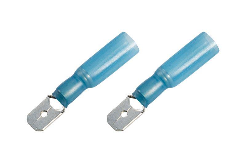 Клемма плоская изолированная термоусаживаемая (КПИт штекер – 6.35 мм) 1.5-2.5 мм2 REXANT предназначена для создания качественного подключения электрооборудования или соединения проводов между собой, которое при необходимости, возможно разъединить без лишних усилий. Такая клемма используется для оконцовывания многожильных медных проводов при монтаже мобильных электрических контактных соединений на подвижном составе (автомобиле-, вагоно-, самолето- и судостроении) или в других местах, где важна надежность соединения (к примеру, телефонное или климатическое оборудование).