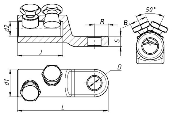 Наконечник болтовой кабельный 2НБВ-2-005 с V-образным расположением болтов предназначены для оконцевания алюминиевых и медных жил кабеля пластиковой изоляцией до 10 кВ. Закрепление наконечника на жиле кабеля осуществляется болтами со срывной головкой, которая скручивается при достижении определенного усилия, обеспечивая надежное соединение. Диаметр отверстия лопатки 2НБВ-2-005 – 13 мм под болт.
