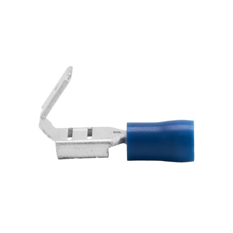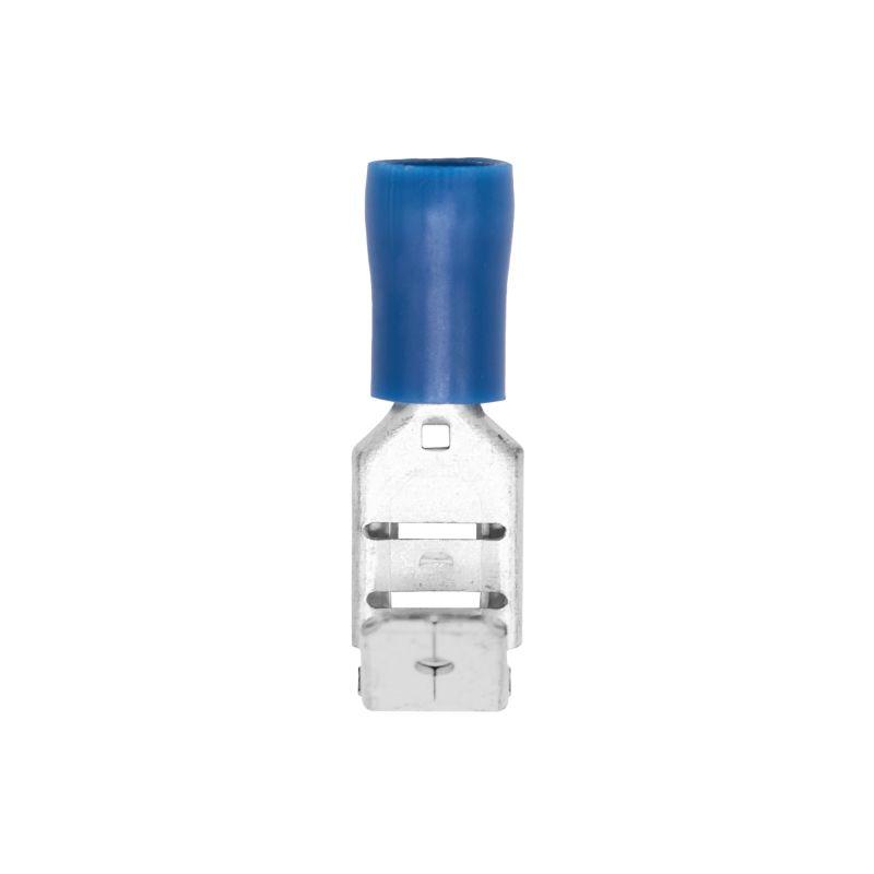 Изолированные плоские наконечники быстрого соединения предназначены для оконцевания кабеля и проводов с медными жилами сечением от 1.5 до 2,5 мм2 в электрических цепях переменного и постоянного тока, напряжение до 600 В. Материал контактной части – электротехническая медь, материал изоляции – ПВХ. Луженое покрытие обеспечивает защиту от коррозии. Фланец изолирован. Номинальный размер соединителя 6,3?0,8 мм2. Цвет – синий.
