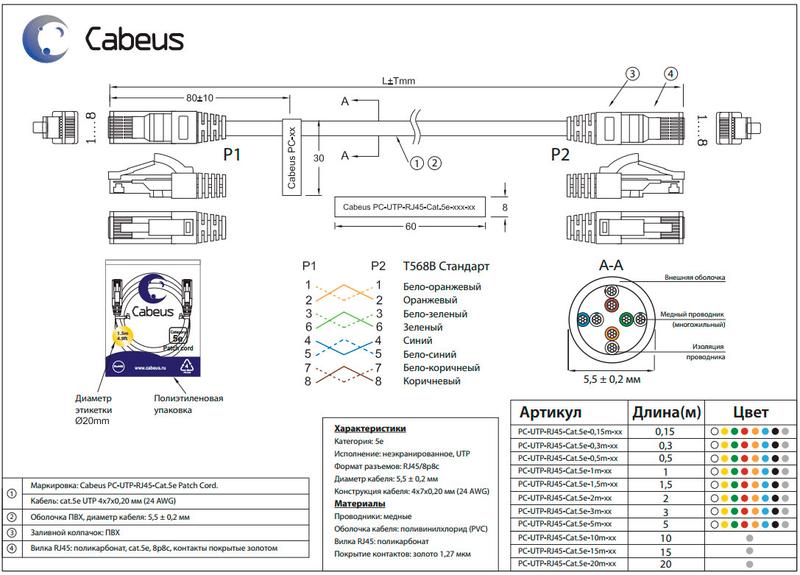 Патч-корд U/UTP кат.5E PC-UTP-RJ45-Cat.5e-3m-BL 2хRJ45/8p8c неэкранир. PVC 3м син. Cabeus 7462c