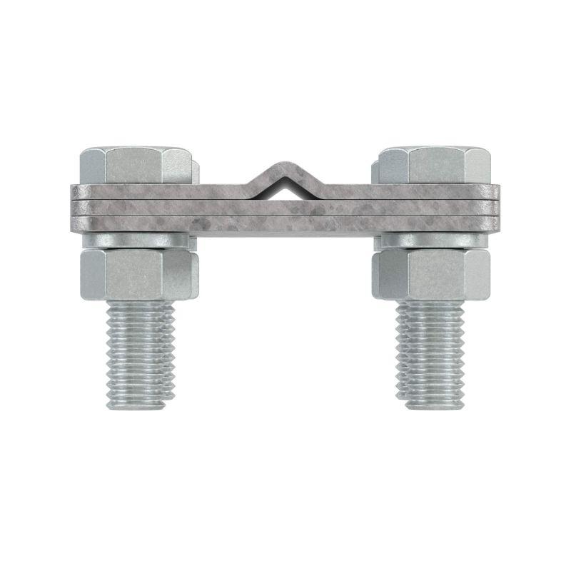 Соединитель “пруток – полоса” с разделительной пластиной используется для параллельного либо крестового соединения прутка 8-10 мм с полосой 25 мм. Материал – горячеоцинкованная сталь.