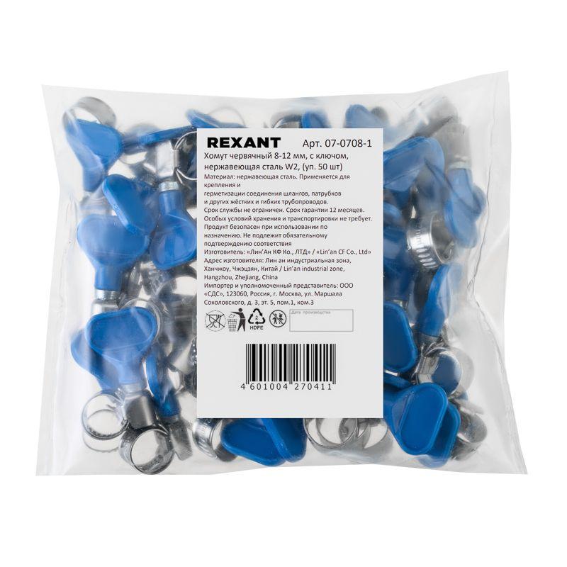 Хомут червячный 8-12/9-0.7мм с ключом нержавеющая сталь W2 (уп.50шт) Rexant 07-0708-1