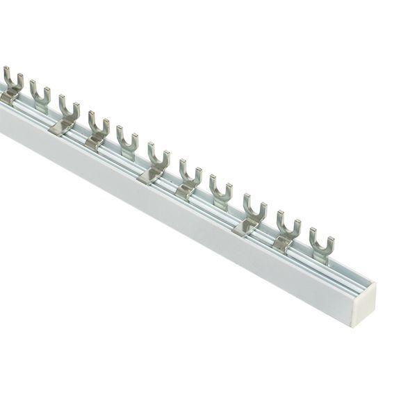 Шины соединительные представляют собой пластины, выполненные из меди (шины на 100 А – из луженой меди), закрепленные в корпусе из диэлектрического материала, не поддерживающего горение, и выпускаются стандартной длиной 1 метр. Шины соединительные делятся на два типа – FORK («вилка») и PIN («гребенка») на номинальные токи 63 и 100 А. Могут быть выполнены в одно- двух- трех- и четырехполюсном исполнений.