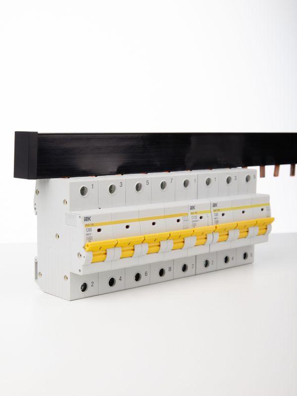Применяются для удобного и безопасного соединения групп: ВА (выключатели автоматические), АД (автоматы дифференциальные), ВД (выключатели дифференциальные), ВН (выключатели нагрузки). Шины с шагом 18 мм предназначены для коммутации аппаратуры шириной, кратной одному модулю, шины с шагом 27 мм предназначены для коммутации изделий шириной, кратной полутора модулям. Шины, рассчитанные на номинальный ток 100 А, могут быть использованы с номинальным током 125 А, если вводной автомат подключать по центру. Для полуторамодульных шин имеются боковые заглушки.